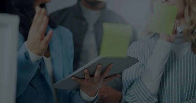 A warehouse worker in a high-visibility vest smiles while reviewing information on a tablet with colleagues nearby.